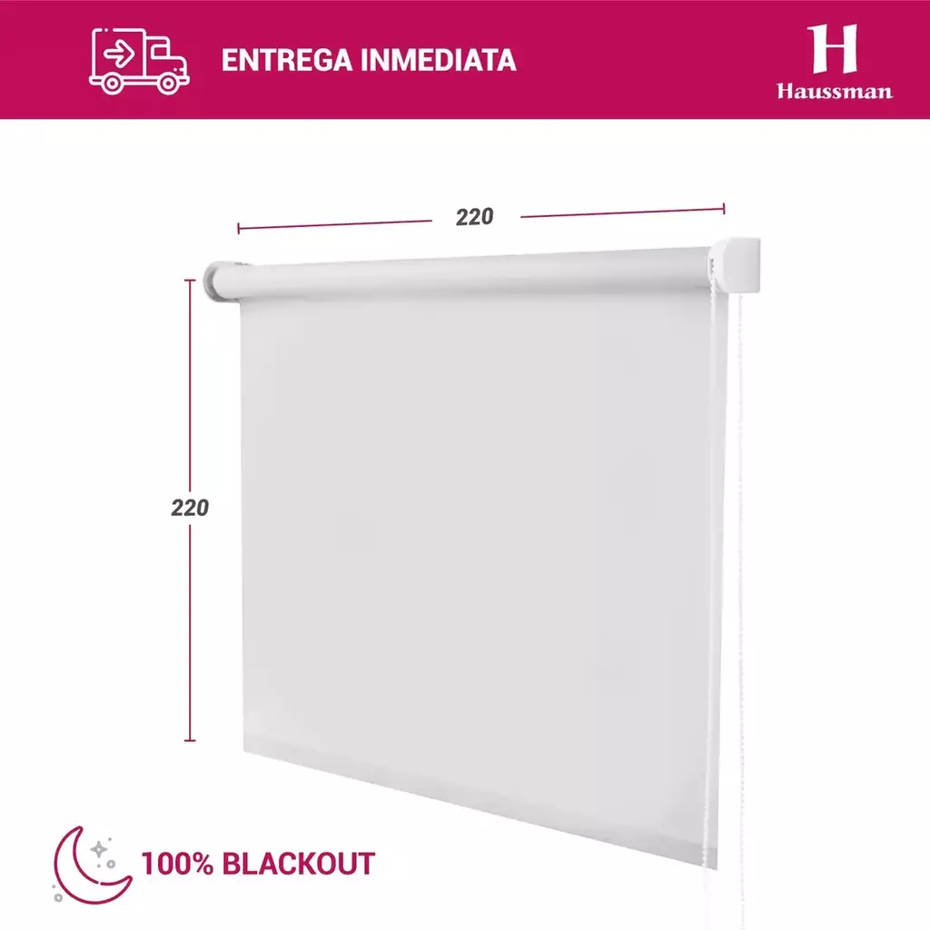 Cortina Roller Blackout 220x220 Blanco, logra un oscurecimiento total en tus ambientes con las cortinas Blackout Haussman, ideales para dormitorios, livings, oficinas, aulas o salas de reuniones donde se requiera privacidad y control de la luz. Disponibles en una amplia variedad de colores, aportan además un toque decorativo moderno y elegante.